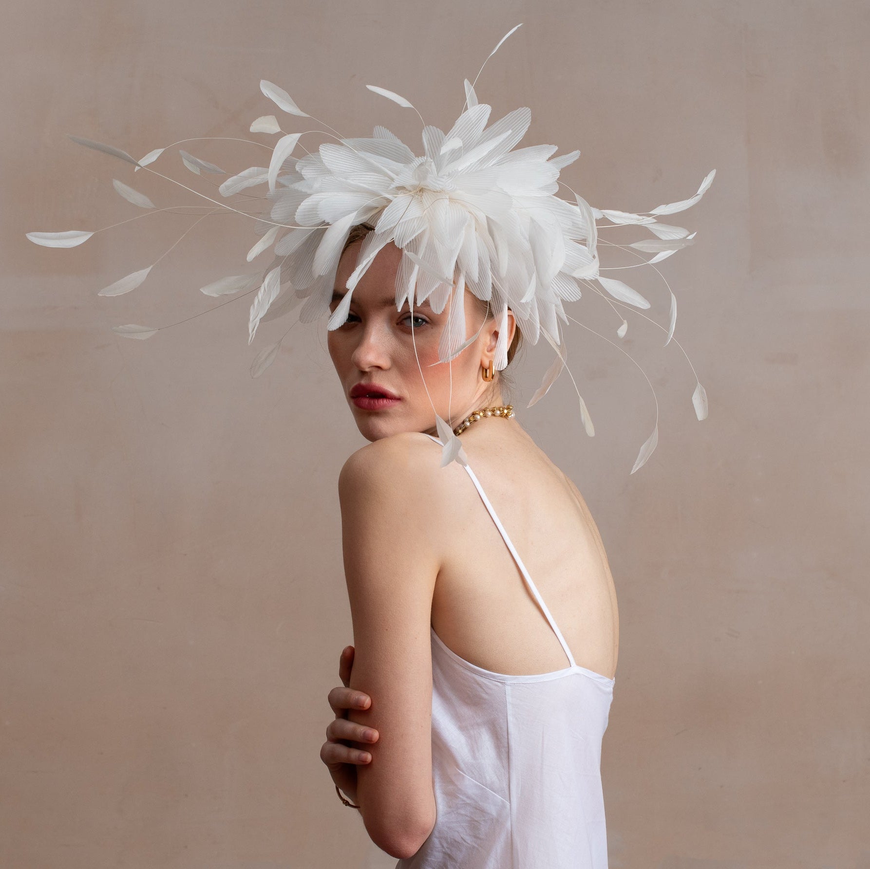 The Dahlia is made of finely pleated organza petals and soft, dancing feather details.