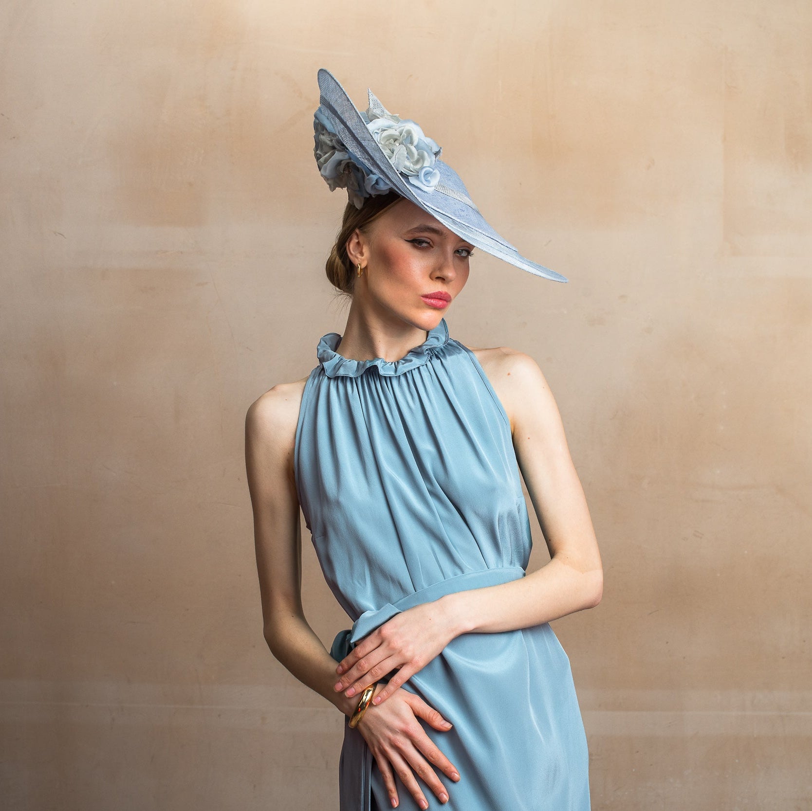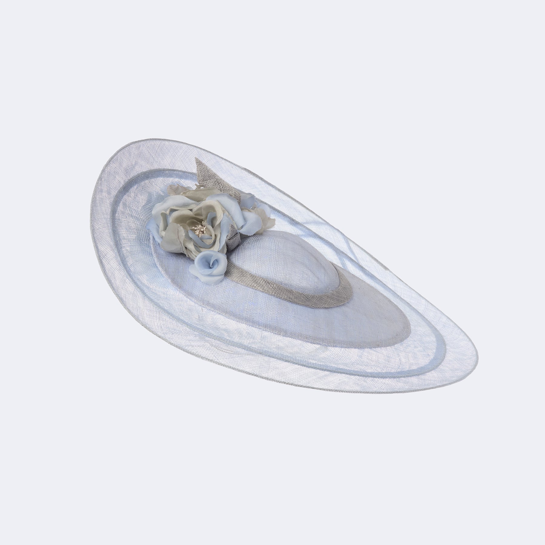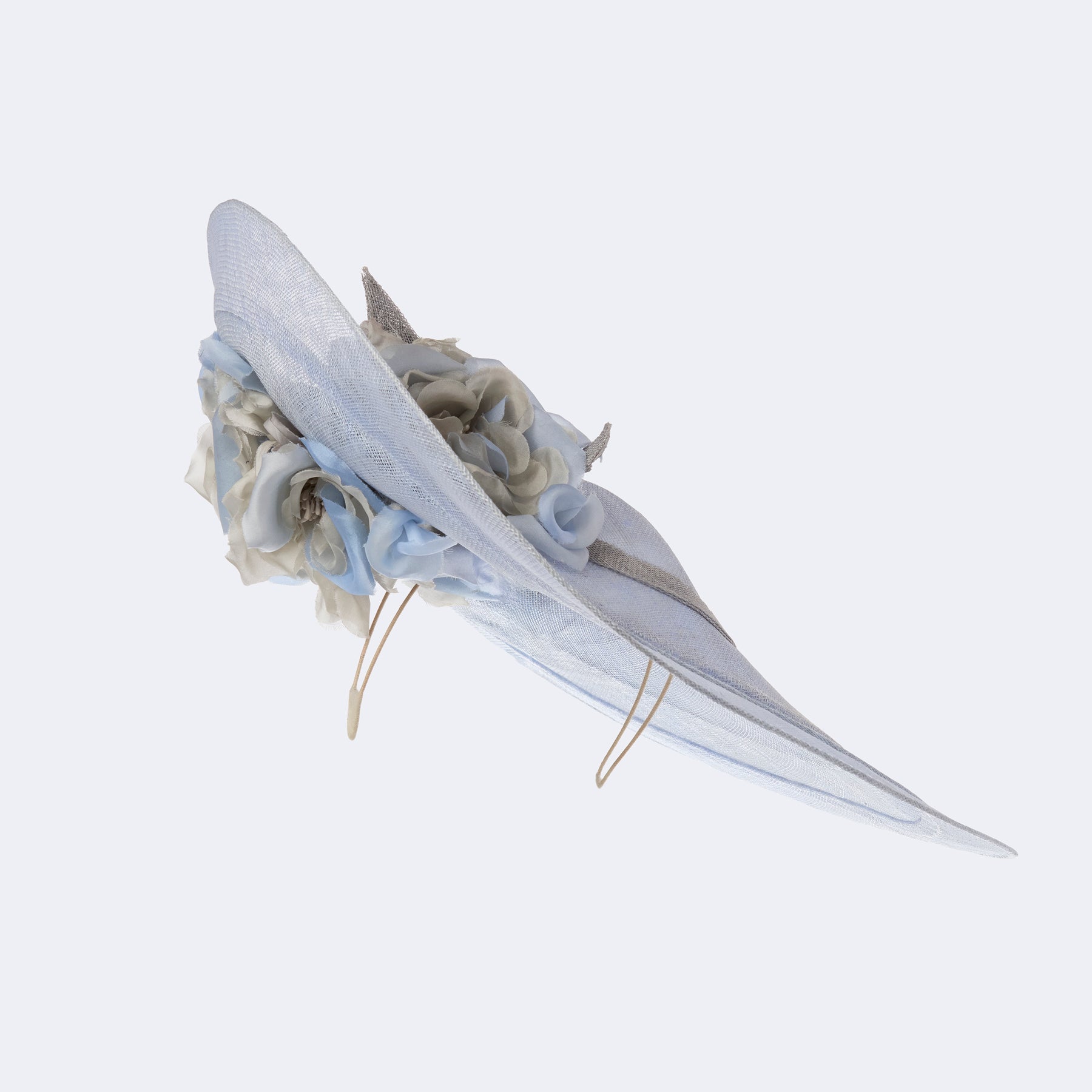 A sky blue sinamay side sweep with handmade silk flowers, with subtle undertones of grey.