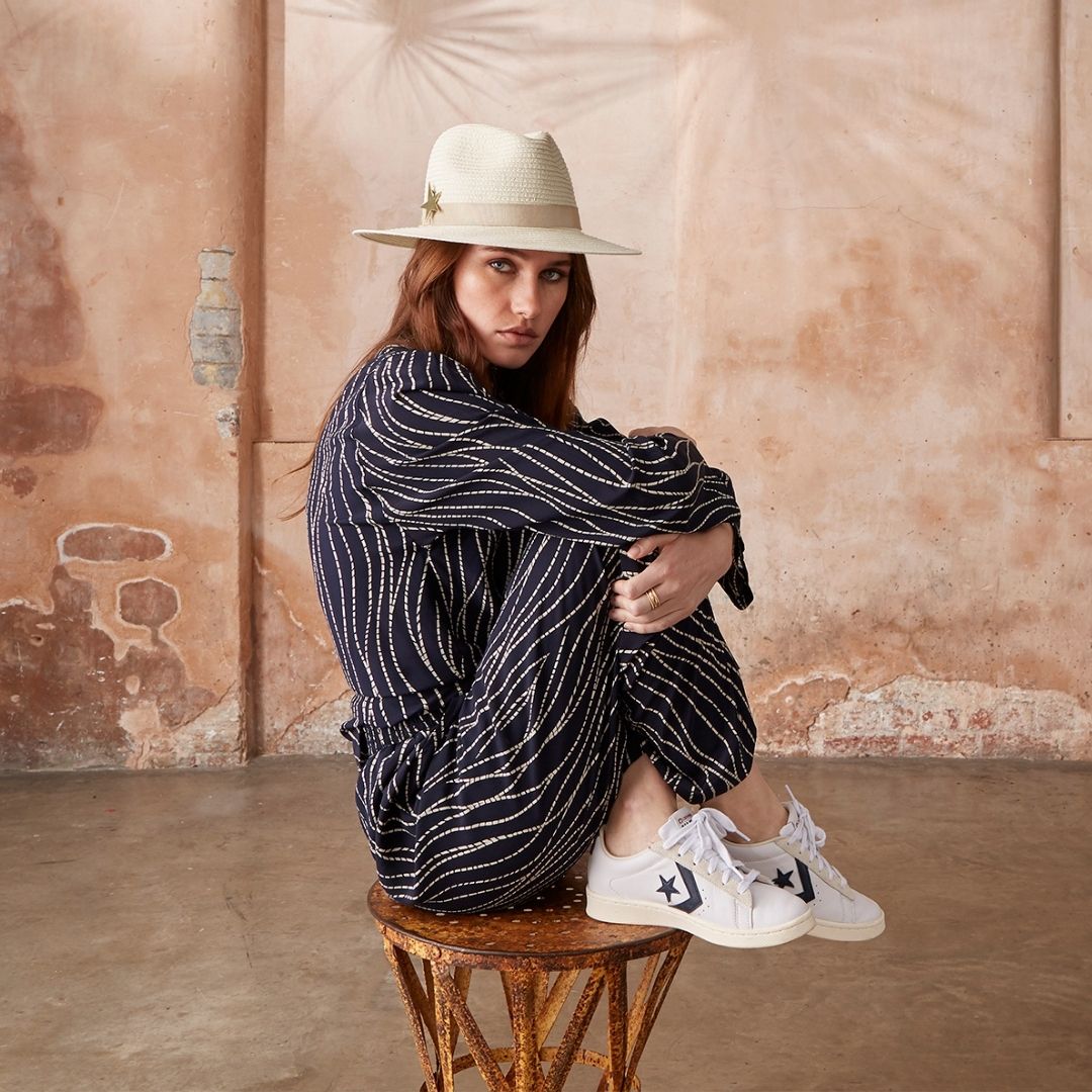An ivory polycotton straw trilby, trimmed with a sand-toned band and star pin. Certified SPF50+ for optimal sun protection, The World Traveller is your go-anywhere summer essential - effortlessly stylish and endlessly versatile.