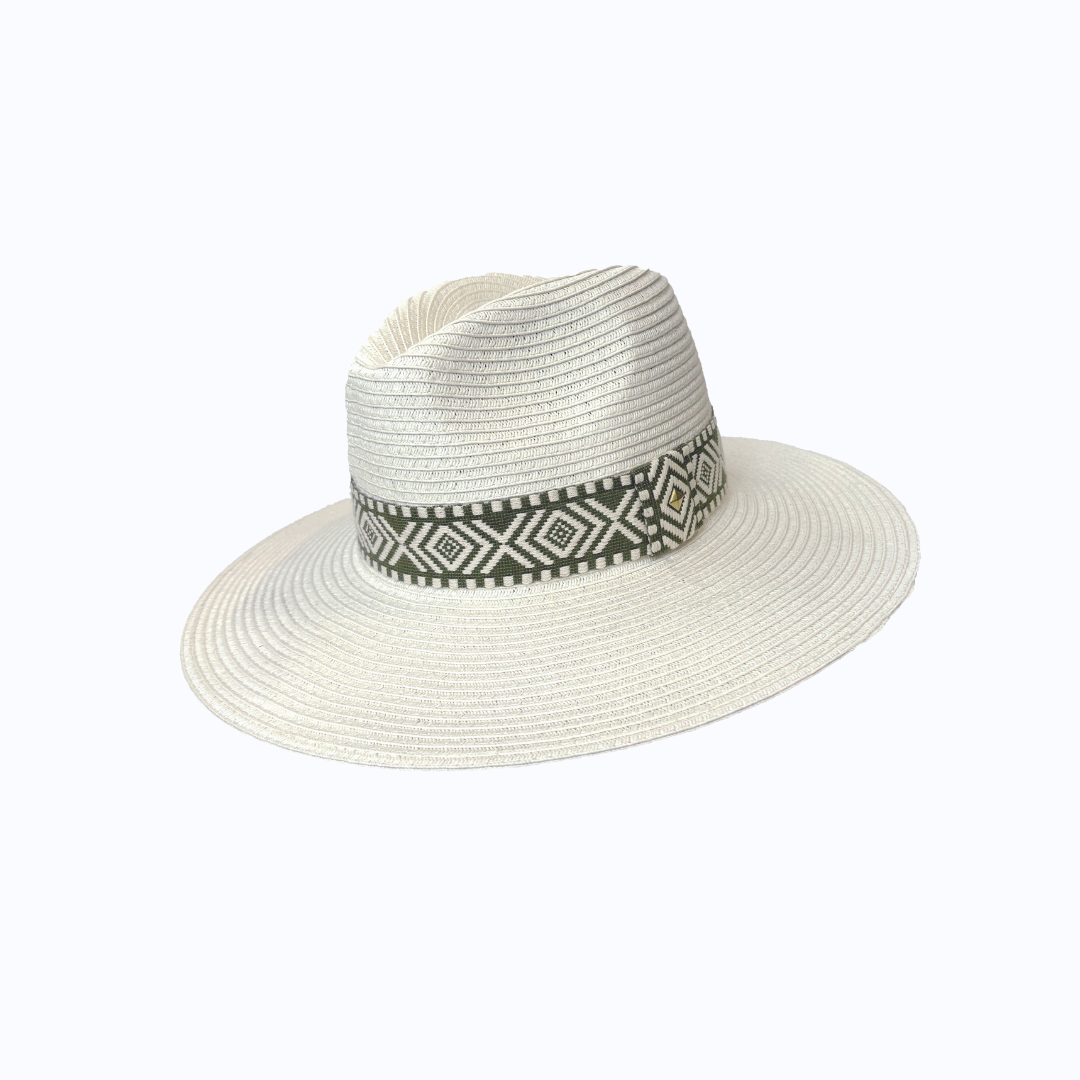 A wide brim ivory polycotton straw trilby, trimmed with an olive geometric band. Certified SPF50+ for optimal sun protection, The World Traveller is your go-anywhere summer essential - effortlessly stylish and endlessly versatile.