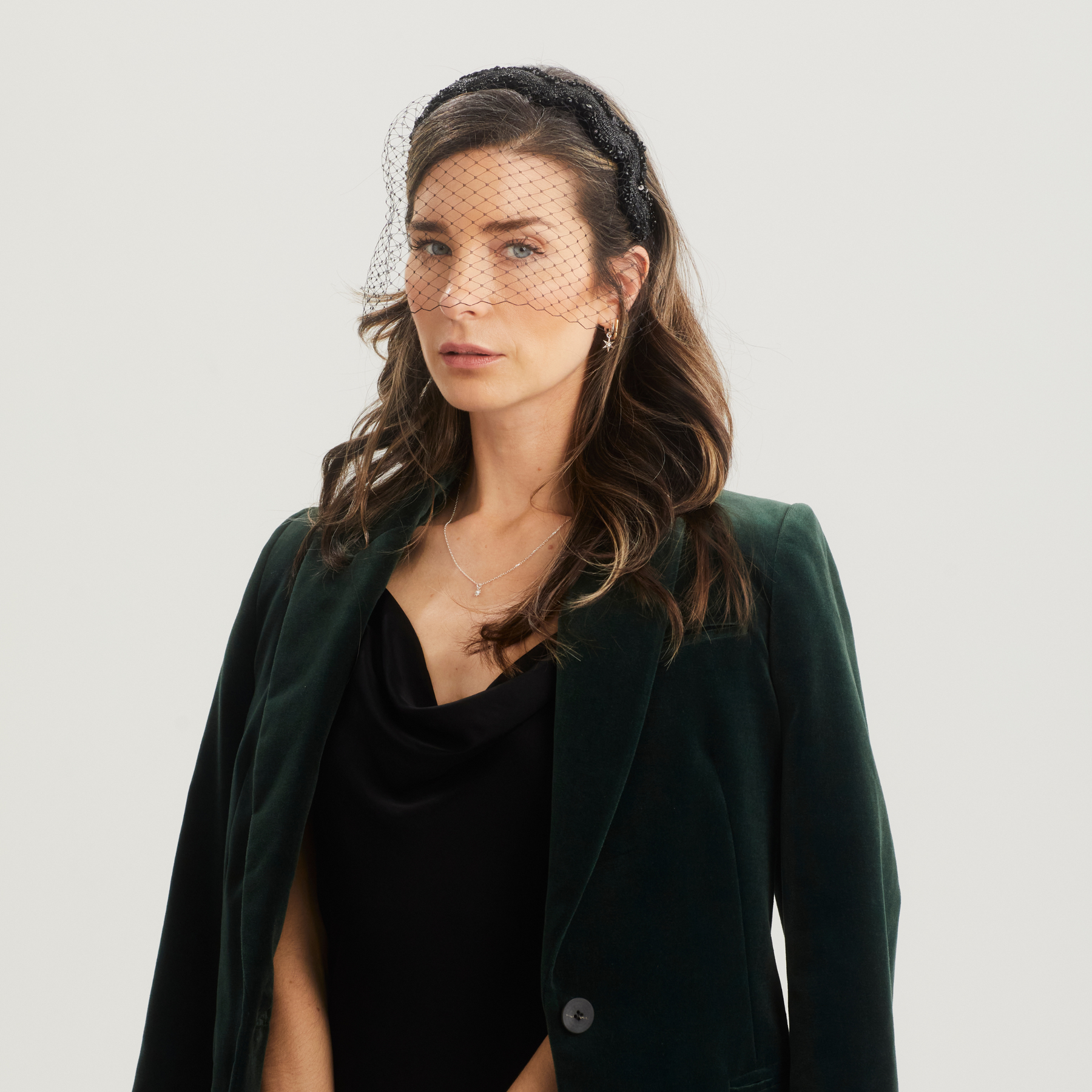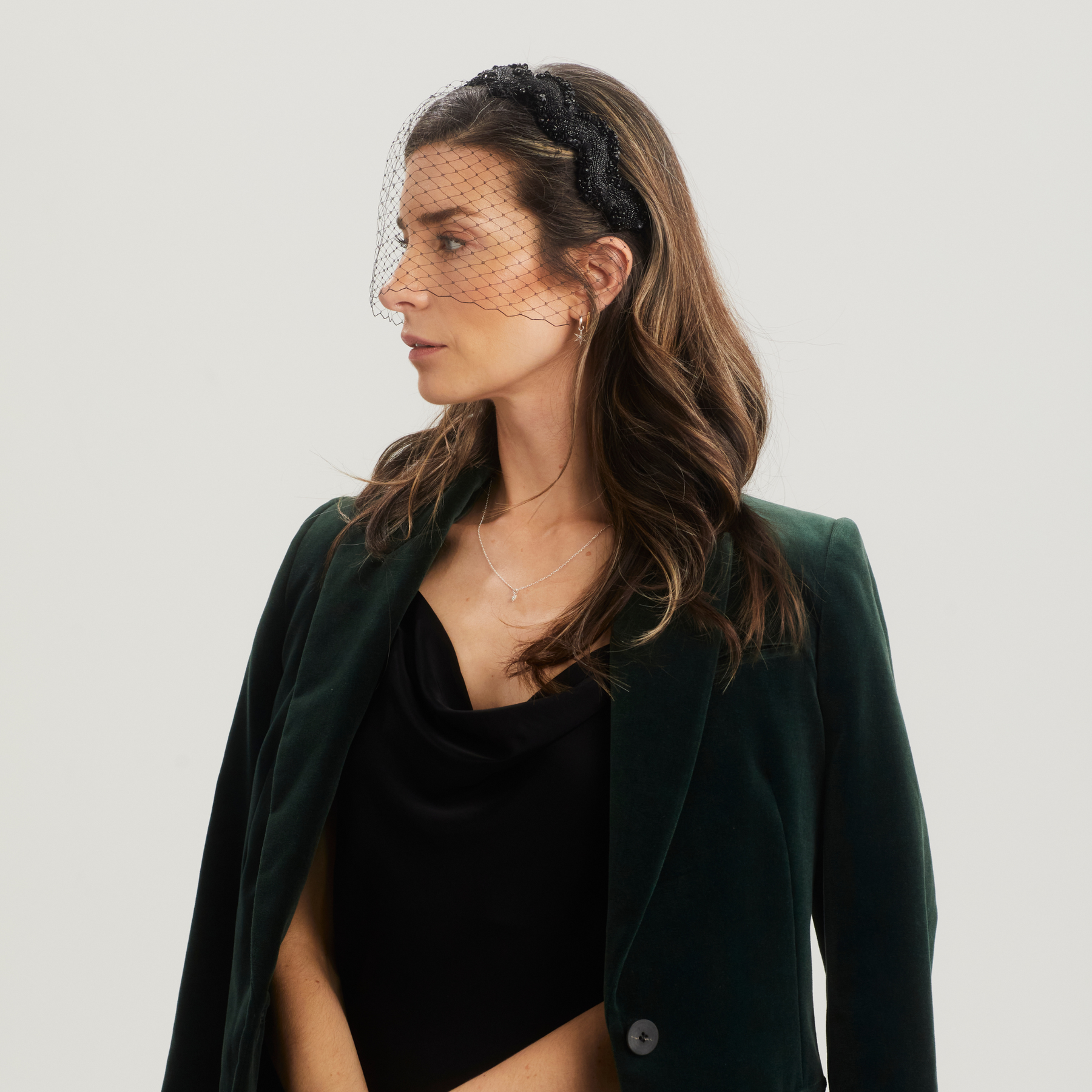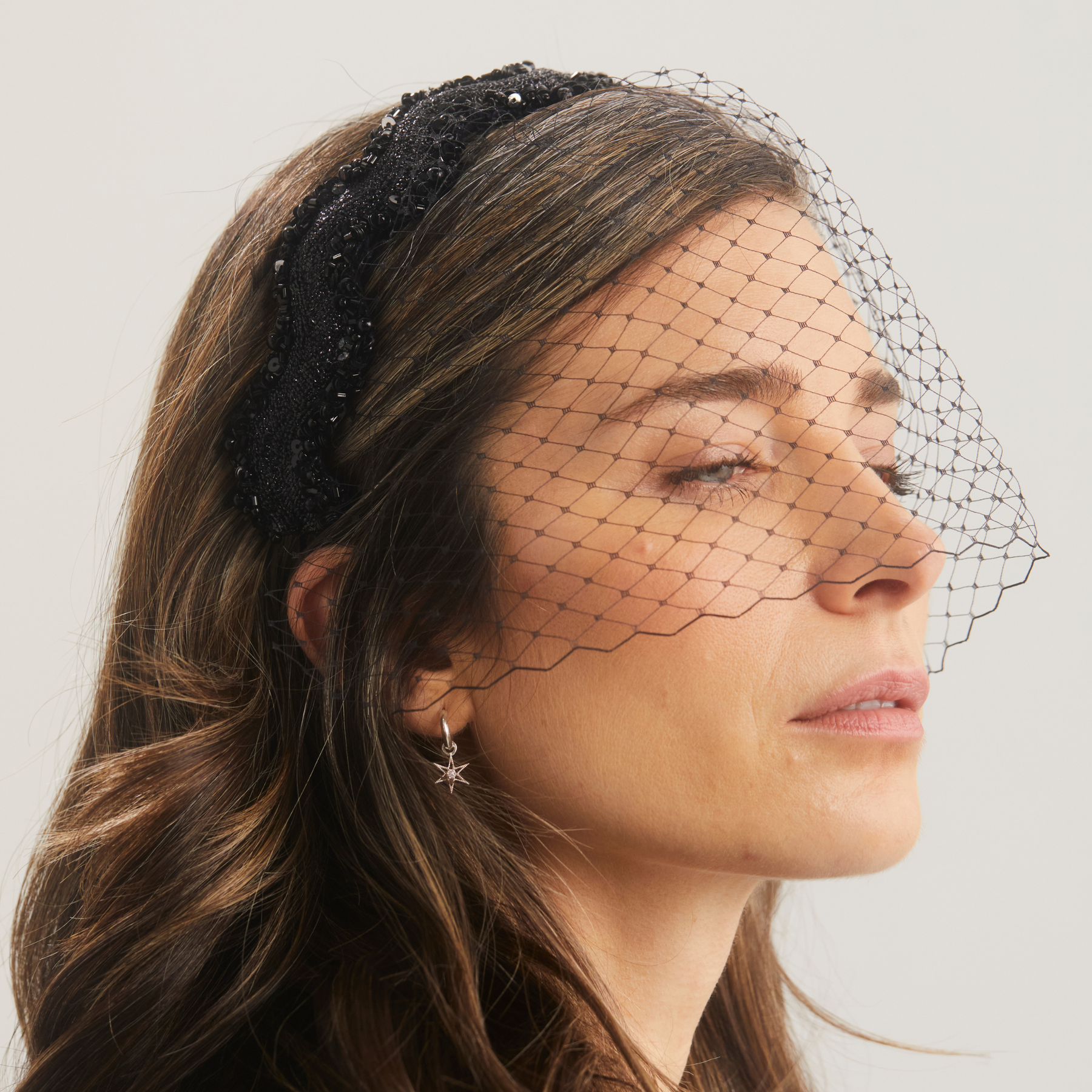 A metallic black wave hairband encrusted with dazzling space rocks which can be worn with or without the detachable veil. This trim has been waiting in the ribbon cupboard for the perfect moment to shine, but availability is very limited.