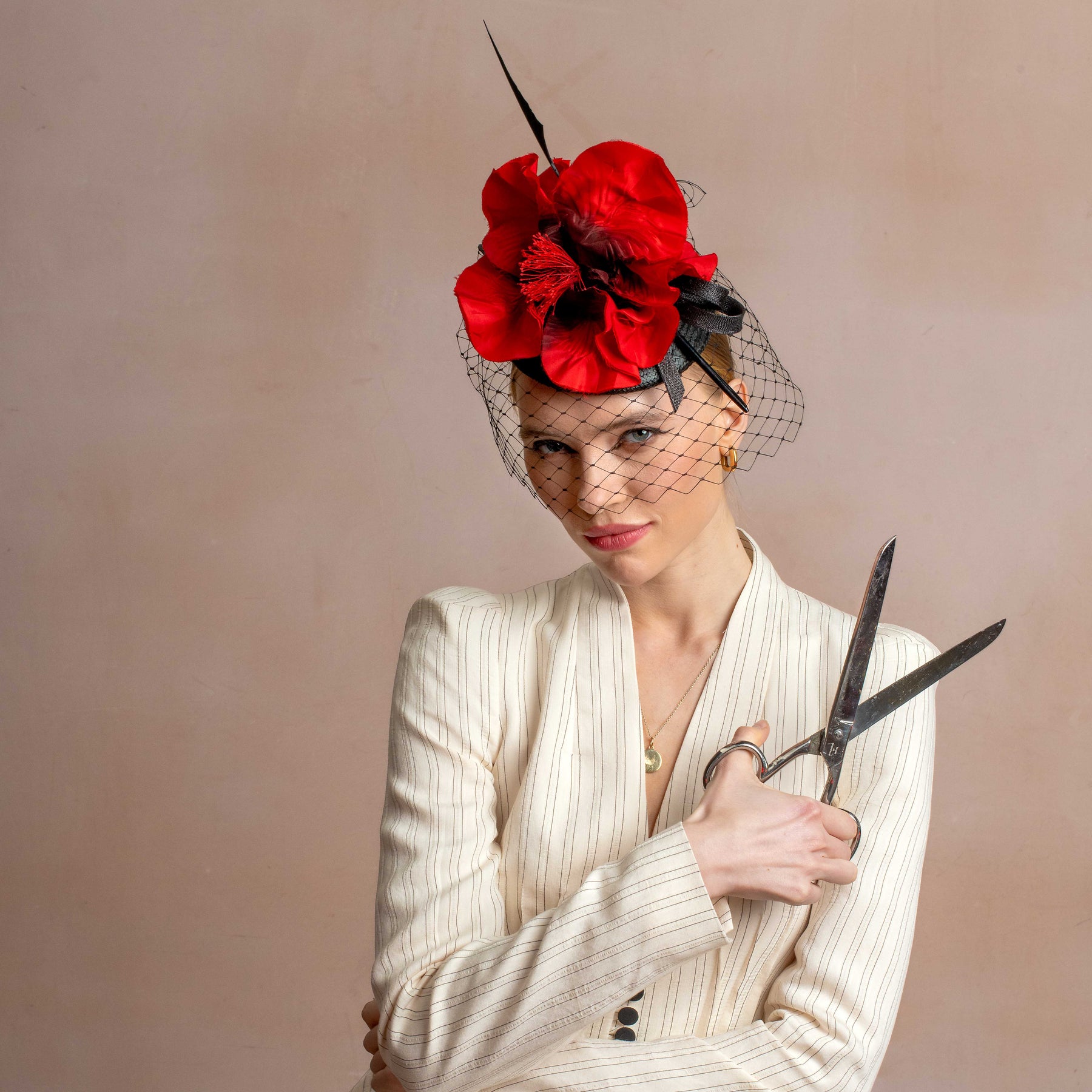 The Poppy is a black sisal straw button hat with a classic, large red poppy flower and a feather arrow detail. The button style is one of our easiest shapes to wear and an elegant sculptural piece with glamorous veiling.